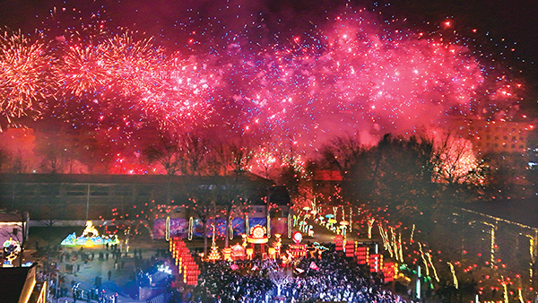 夜幕降临,室外“闹红火”好戏连台。平定武迓鼓铿锵有力,盂县牛斗虎刚劲灵动,张庄村武社火气势雄浑,龙灯舞、秧歌添彩助兴。绚烂烟花腾空而起,与地面社火表演交相辉映,将节日氛围推向高潮。(张晓茹 刘胜 张泽慧 杨园园)